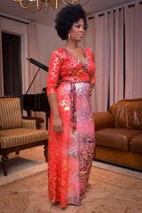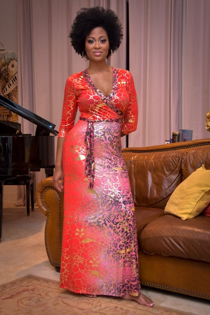 All Eyes on You! in this red multi leopard print 3/4 sleeve wrap maxi dress with gold accents all around  Made In: USA