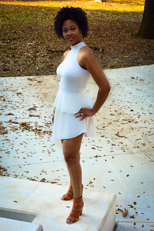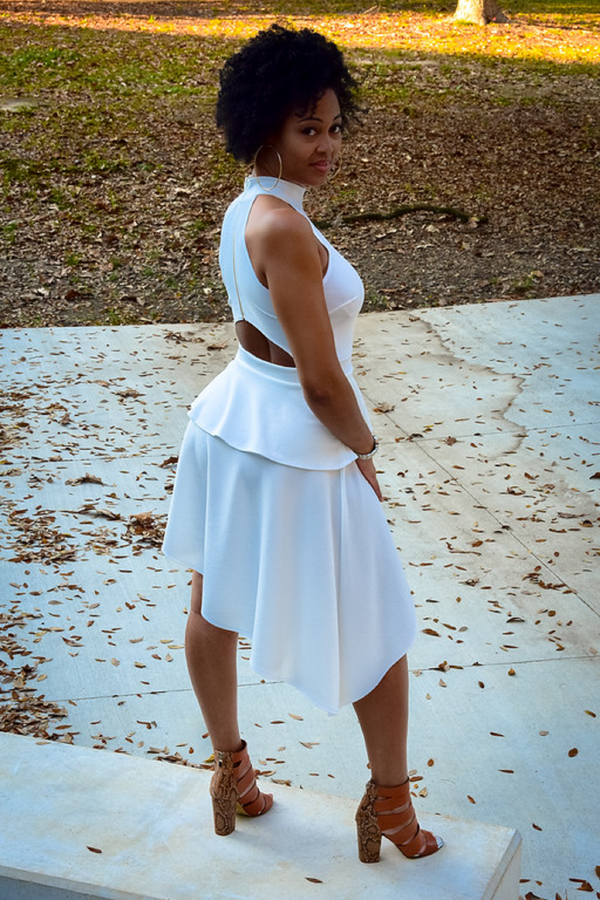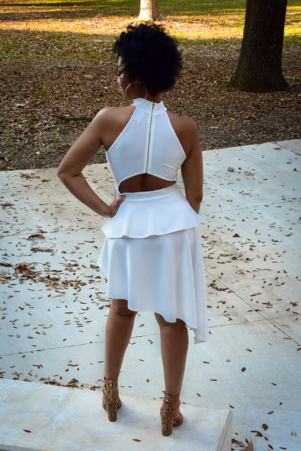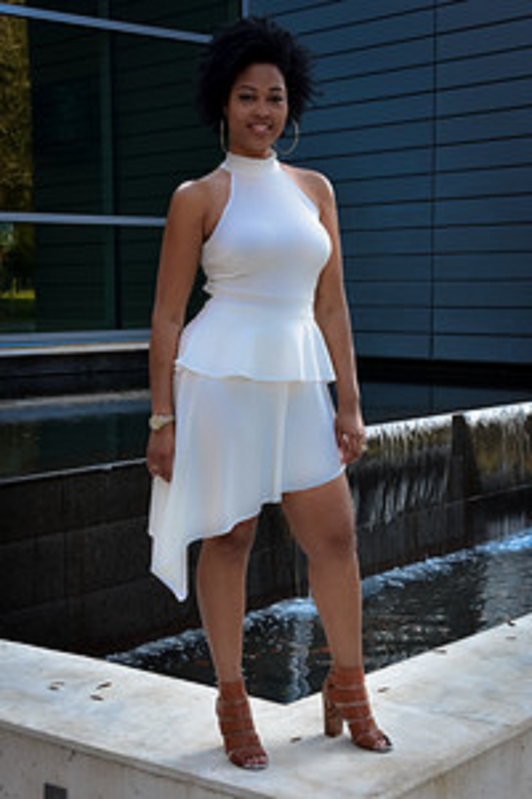 This is the outfit to enjoy the warmth of the sun! The cascading asymmetrical hem and peek-a-boo back make Aria your perfect spring/summer dress. Color: White High mock neckline Sleeveless Banded waist provides contour Tiered asymmetrical hem Mini to Midi-length 96% Rayon/4%...