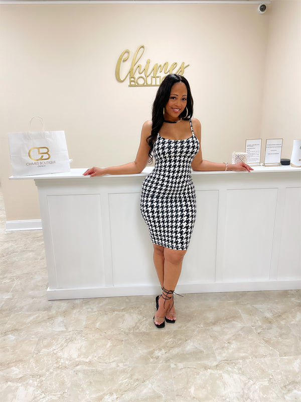 Black/white Casual, Elegant Houndstooth Midi length Stretch level - minimum Bodycon Double layer (no see through) Spaghetti Straps Slim fit Round neck Sheer: no Fabric: 92% Polyester, 8% Spandex Model is wearing a size medium