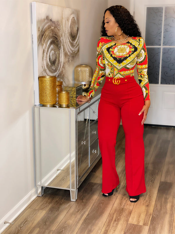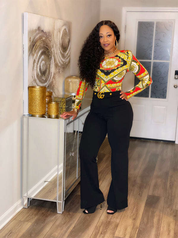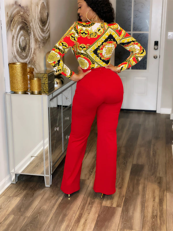 Color: Red multi Bodysuit  Snap between the legs Round neck Long sleeves Fitted Stretchy Fabric: 96% polyester/4% spandex Model is wearing a medium Shown with Overqualified Pants (sold separately)