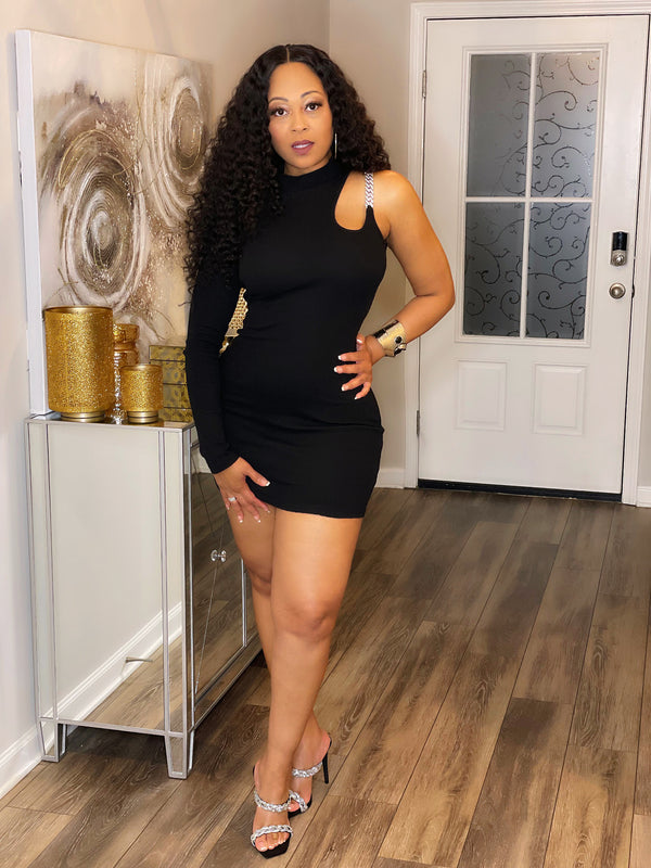 Black  Asymmetrical sleeves  Rhinestone detail strap Fitted Pull on style (no zipper) Mini length Stretchy True to size Model is wearing a medium