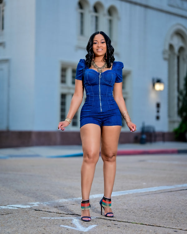 Light or dark denim good stretch  front zipper  sculpted sweetheart neckline  contoured waist short puff sleeves  true to size