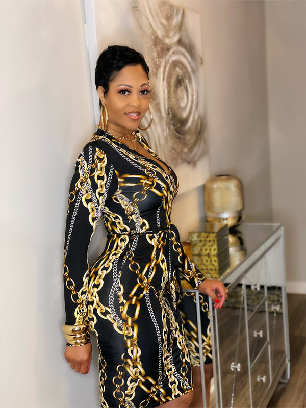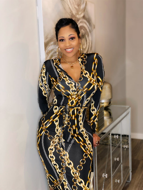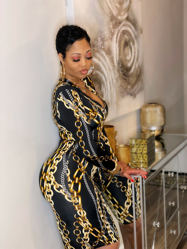chain print long sleeve midi length Front zipper matching self waist band soft silky material  great stretch true to size Model is 5”9” and wearing a size medium  Fabric: 95% Polyester, 5% Spandex   Made In: USA